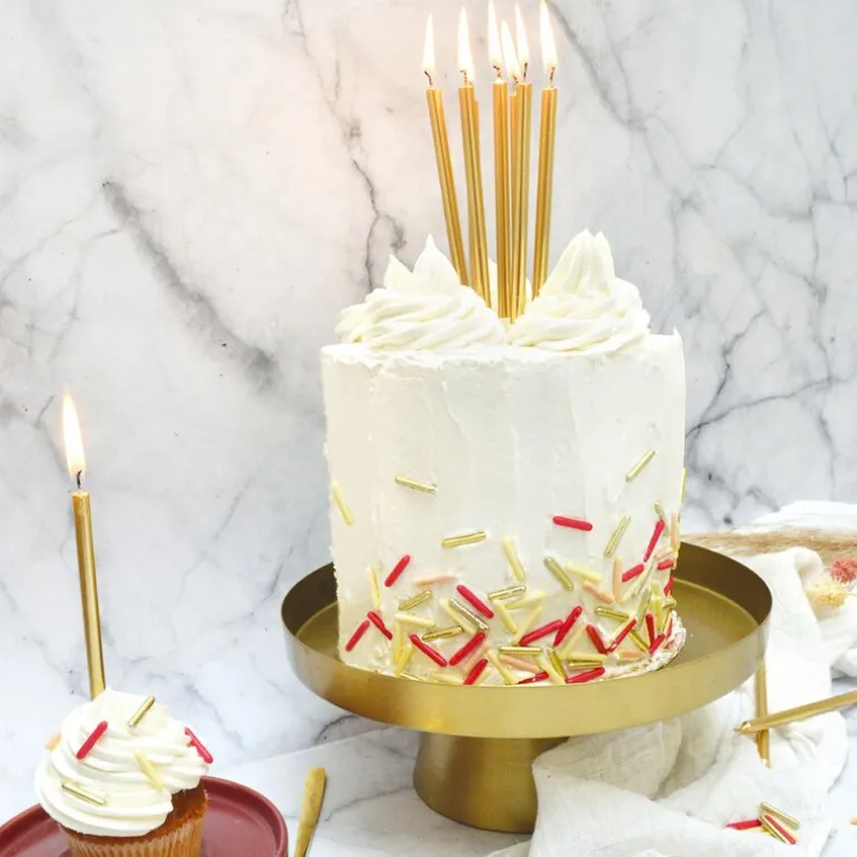Disse lange kakelysene i gull fra ScrapCooking er perfekte for å sette en elegant og festlig stemning på kakebordet. Enten det er til bursdag, jubileum eller en spesiell feiring, tilfører de en vakker glød og løfter hele presentasjonen.