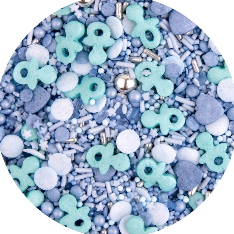 Nydelig kakestrøssel, blå babylykke, fra Cacas. Pynt opp dine bakverk med dette søte kakestrøet fra Cacas. Miksen består av strø med babymotiv og inneholder smokker, perler, crispy kuler, vermicelli m.m. i nydelige blåtoner. Bruk strøet som pynt på både cupcakes, kaker, cakepops og cookies. Skal du pynte kake eller cupcakes til babyshower eller dåp er denne miksen perfekt.