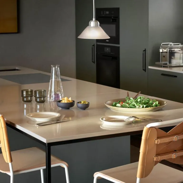 Lampeskjermen i klar glass har en frosted innside som gir en myk og rettet lysbilde, og kombinerer pragmatisk funksjonalitet med en strålende estetikk