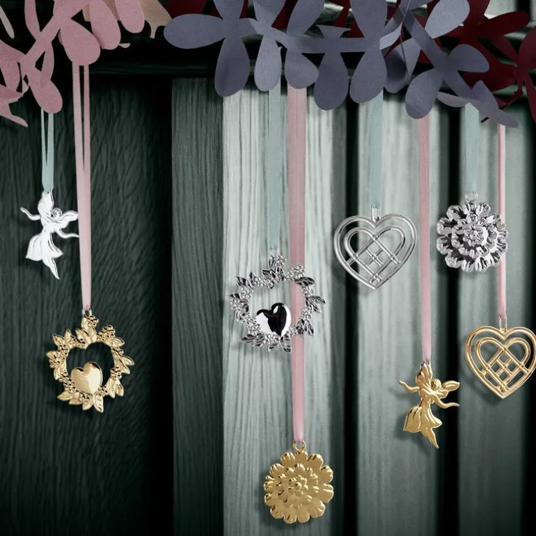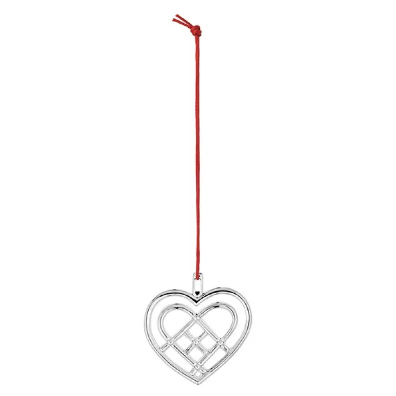 I 2024-kolleksjonen finner vi det sølvbelagte «flettede julehjertet», som er omkranset av et større hjerte og symboliserer kjærlighet og samvær i juletiden. Med en høyde på ca. 7 cm er dette hengepynten perfekt som vindusdekorasjon, og det er ett av flere små hengepynt i serien.