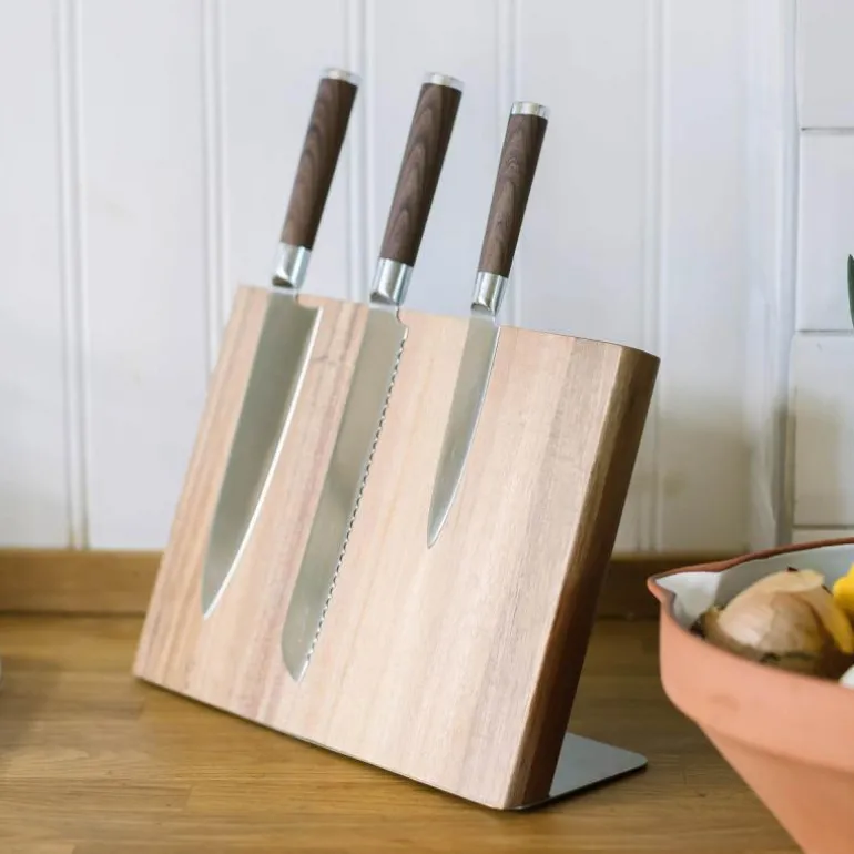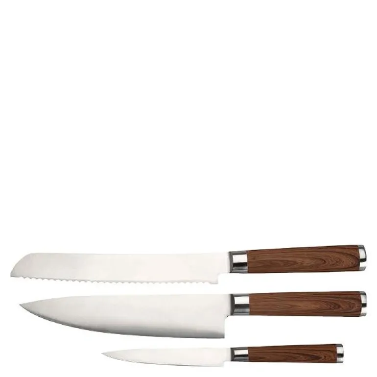Forenkle tilberedningen ved å bruke virkelig skarpe kniver. Kasimas knivsett består av tre praktiske kniver med stilige treimitasjonshåndtak som enkelt skjærer opp brød og grønnsaker. Kasima knivsett i rustfritt stål, kokk, brød, allsidig kniv