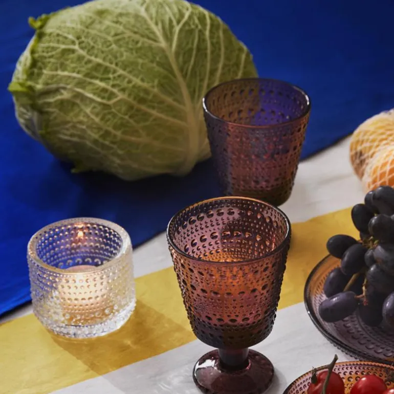 Iittala glassfabrikks sterke fargeekspertise er godt synlig i den vakre fargen røsslyng, som er inspirert av den blomstrende skogen og fremhever perleradene vakkert i Oiva Toikkas Kastehelmi. Den balanserte blårøde fargen gir en elegant nyanse til høytidens borddekking. Det allsidige 30 cl drikkeglasset skaper en festlig følelse selv i hverdagen.