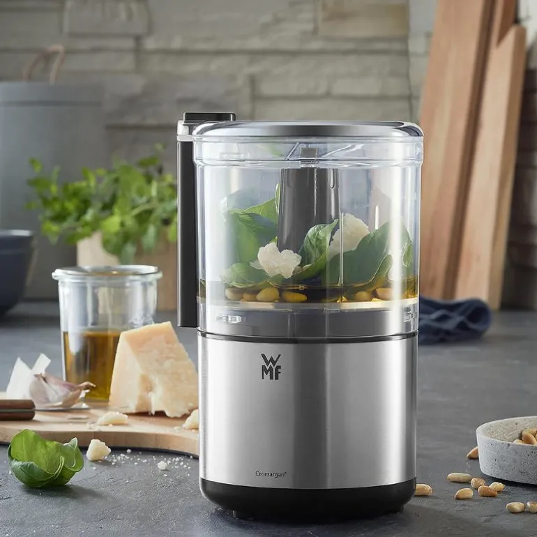 Kimis elektrisk minihakker 0,4L fra WMF. Du trenger aldri mer hakke urter, løk eller nøtter selv! Dette vesle kjøkkentilbehøret i elegant Cromargan leverer flotte hakkeresultater og kan bekvemt betjenes med én hånd. Utstyrt med en 0,4 l beholder av BPA-fri tritan, en tobladet kniv i rustfritt stål med WMF Perfect Cut-teknologi og en spesiell sikkerhetslåsemekanisme. Kan også brukes til å kutte ost eller sjokolade i små stykker lett som ingenting. Alle avtakbare deler tåler oppvaskmaskin og kan raskt vaskes så de blir klare til bruk igjen.