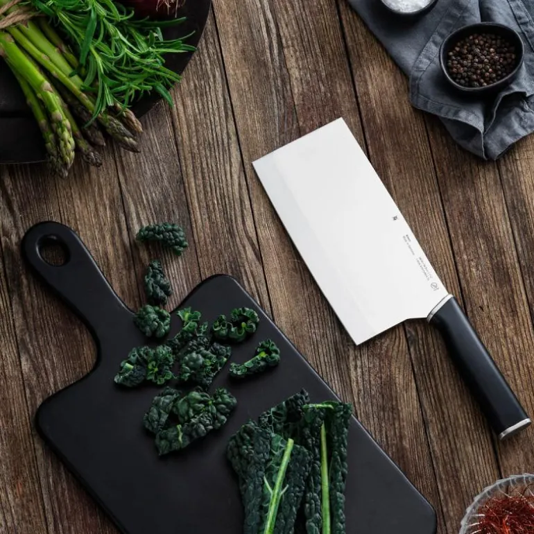 Kineo kinesisk kokkekniv 18,5 cm (31 cm)Kineo-knivserien består av til sammen 9 forskjellige kniver – fra den vanlige all-rounderen til kokkekniven og den kinesiske kjøttøksen. Selv om de enkelte knivbladformene er veldig forskjellige, er egenskapene til det spesialherdede rustfrie stålet glimrende. Takket være den patenterte WMF Performance Cut-teknologien gir bladene enestående langvarig skarphet dag etter dag, kutt etter kutt. Det kinetisk ergonomiske designet med håndtak i rustfritt stål sikrer et behagelig grep og en balansert følelse når man kutter, hakker og skjærer. Kineo-knivserien: den perfekte kniven fra starten – med et enestående forhold mellom pris og prestasjon, fremstilt i Tyskland.