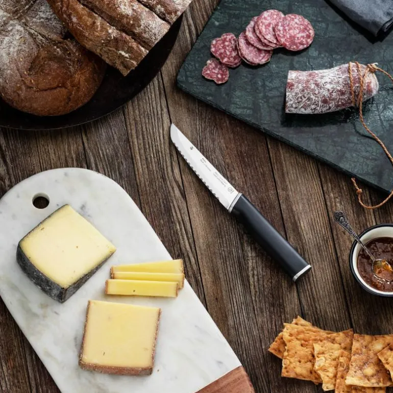 Kineo universal kniv 12 cm (24 cm)Kineo-knivserien består av til sammen 9 forskjellige kniver – fra den vanlige all-rounderen til kokkekniven og den kinesiske kjøttøksen. Selv om de enkelte knivbladformene er veldig forskjellige, er egenskapene til det spesialherdede rustfrie stålet glimrende. Takket være den patenterte WMF Performance Cut-teknologien gir bladene enestående langvarig skarphet dag etter dag, kutt etter kutt. Det kinetisk ergonomiske designet med håndtak i rustfritt stål sikrer et behagelig grep og en balansert følelse når man kutter, hakker og skjærer. Kineo-knivserien: den perfekte kniven fra starten – med et enestående forhold mellom pris og prestasjon, fremstilt i Tyskland.