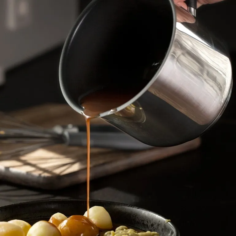 Denne sauskasserollen fra Kitchen Essentials er ideell for tilberedning og servering av sauser, dressinger, marinader og til og med kakao. Kasserollen er utstyrt med en praktisk helletut, noe som gjør serveringen presis og enkel uten søl. Med en 4 mm aluminiumskjerne oppnår du rask oppkoking og optimal varmefordeling, som både sparer energi og gir jevne resultater. Det svarte KFCC G7 keramiske belegget hindrer mat fra å brenne seg fast og gjør rengjøringen enkel. For å beskytte belegget anbefales det å bruke redskaper av tre eller plast.