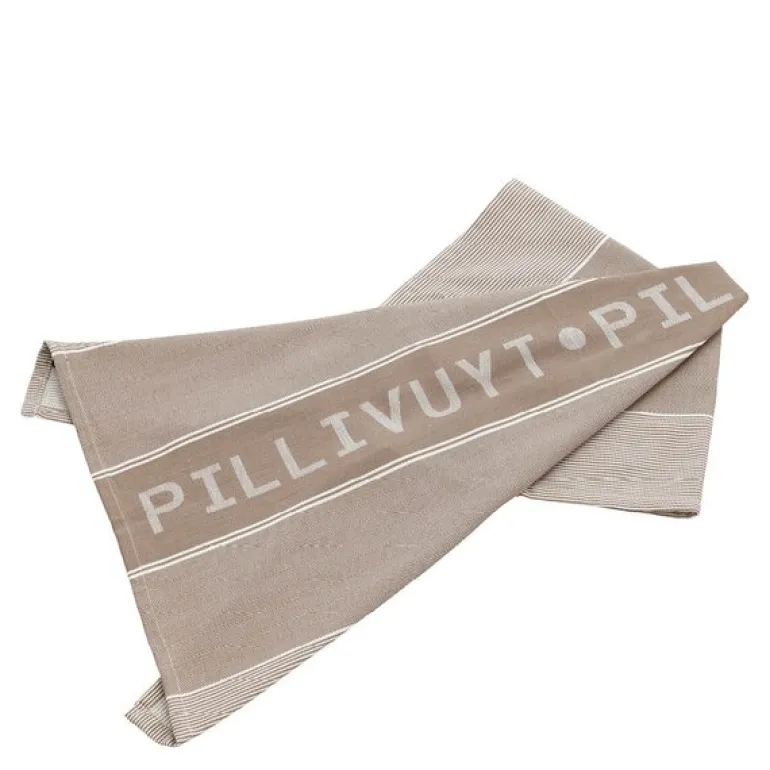Kjøkkenhåndkle fra Pillivuyt, i hvit og fungi, måler 80×50 cm og er laget av resirkulerte stoffrester som får nytt liv gjennom en nøye prosess med sortering, oppdeling til tekstilfibre og veving. Dette gir hvert håndkle en unik karakter, med små variasjoner i nyanser mellom partiene. Det klassiske designet og fargekombinasjonen gjør det til et dekorativt og funksjonelt innslag på kjøkkenet.