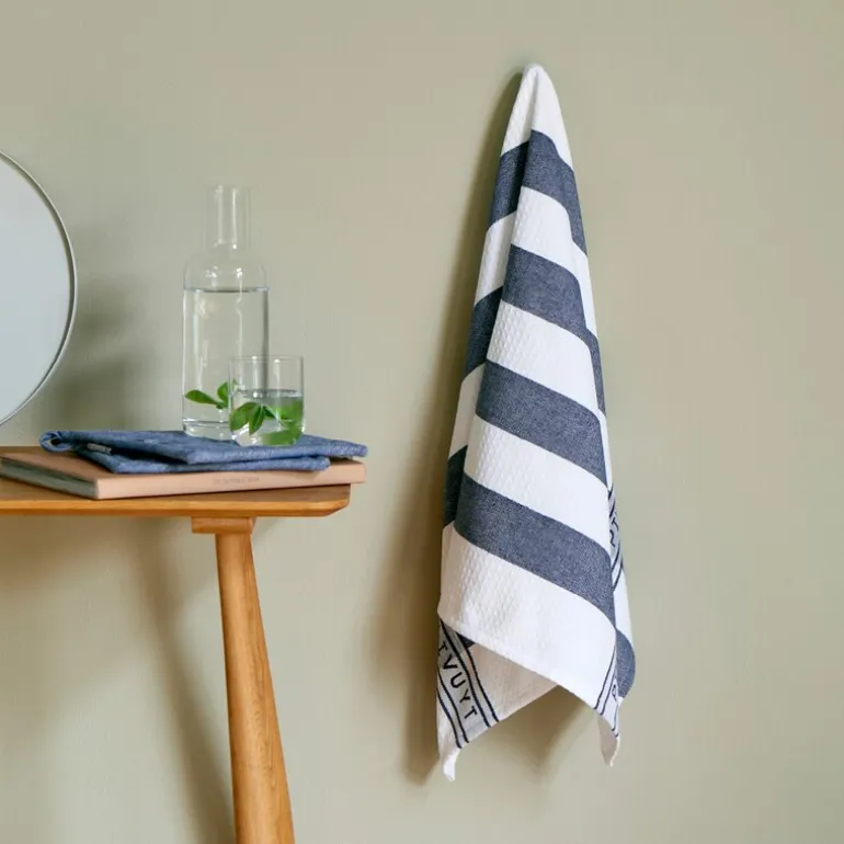 Pillivuyts kjøkkenhåndkle i størrelsen 60×90 cm i blått og hvitt er et funksjonelt valg for kjøkkenet. Det produsert av resirkulerte tekstilfibre, der stoffrestene sorteres, brytes ned og veves på nytt. Dette kan medføre små variasjoner i fargetonen fra parti til parti.