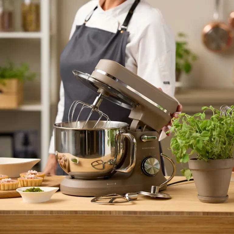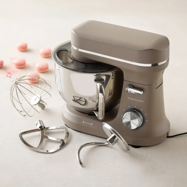 Kjøkkenmaskin på 800W i fargen latte fra Blomsterbergs er en elegant og effektiv hjelper til både små og store oppgaver på kjøkkenet. Maskinen har en stillegående motor på 800 watt, 6 hastighetsinnstillinger og en romslig 5-liters blandebolle i rustfritt stål.