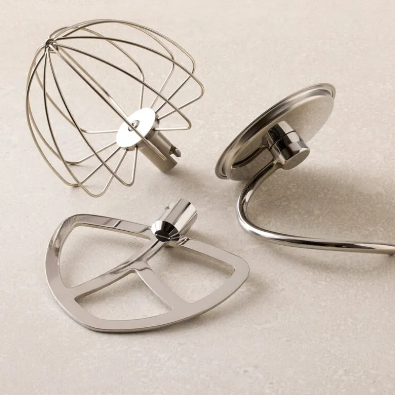 Tilbehør som visp, deigkrok og flatvisp i rustfritt stål følger med, noe som gjør den allsidig og praktisk.