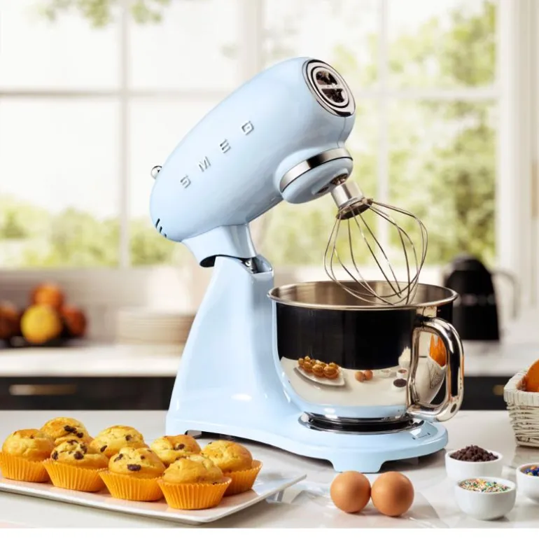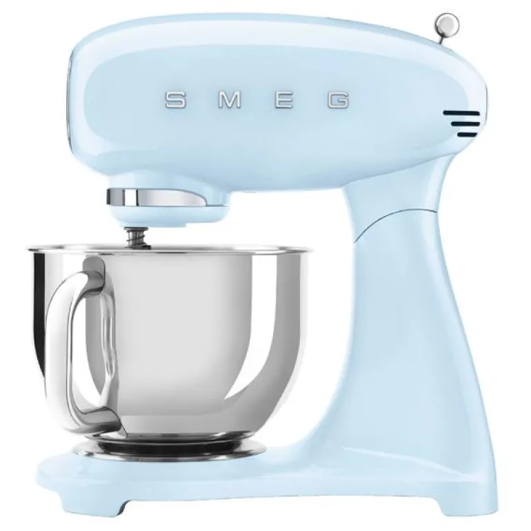 Smeg kjøkkenmaskin SMF03 4,8L i fargen pastellblå. En helfarget kjøkkenmaskin fra Smeg i 50’s Style Retro design, tilfører en eksplosjon av farge på kjøkkenet og er en vakker innredningsdetalj, samtidig som den hjelper deg med å ta dine kulinariske evner til et helt nytt nivå. Det følger også med forskjellige typer standardtilbehør, slik at du kan begynne å lage mat og bake med det samme. Med Smegs kjøkkenmaskin sparer du både tid og energi samtidig som du får bedre resultat på kjøkkenet.