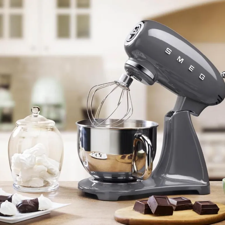 SMEG kjøkkenmaskin (SMF03) grå er maskinen for deg som liker å bake – og god design. Det stilige 50-tallsdesignet i grått, kombinert med en kraftig motor på 800W, gjør at denne kjøkkenmaskinen imponerer både med utseende og funksjonalitet.