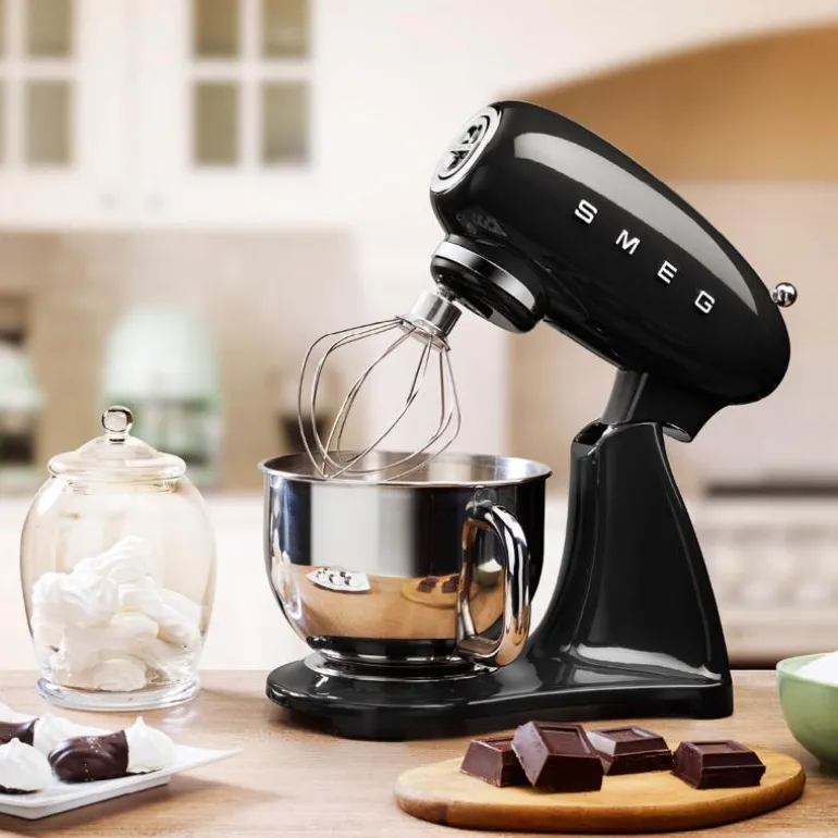 SMEG kjøkkenmaskin (SMF03) svart er maskinen for deg som liker å bake – og god design. Det stilige 50-tallsdesignet i svart, kombinert med en kraftig motor på 800W, gjør at denne kjøkkenmaskinen imponerer både med utseende og funksjonalitet.