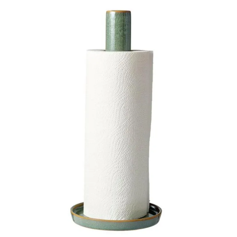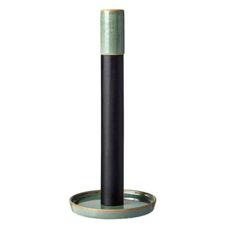 Kjempefin kjøkkenrullholder som passer like fint på kjøkkenbenken som på middagsbordet. Den praktiske kanten på holderens fot sørger for at papiret ikke ruller seg ut. Holderen er 28 cm høy, og de øverste 6,5 cm er i steintøy med reaktiv glasur. Foten og toppen av håndtaket er i steintøy.