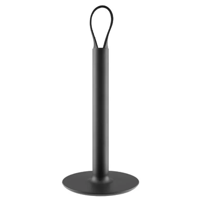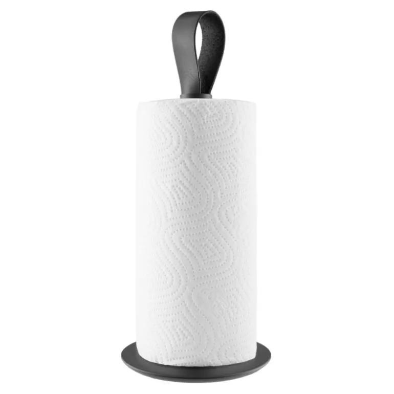 Kjøkkenrullholderen er i rustfritt stål med en lekker stropp av kjernelær, noe som gjør det enkelt å ta med seg rullen fra rom til rom.