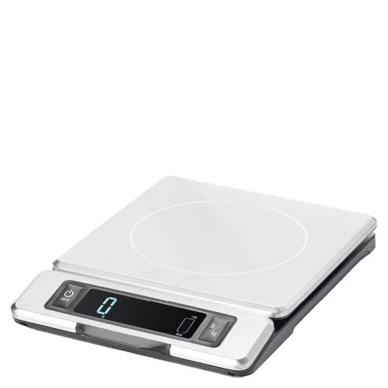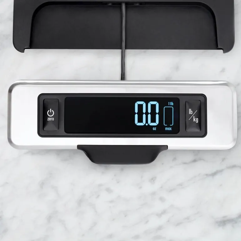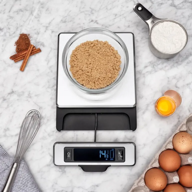 Kjøkkenvekt 24×18 cm fra OXO i rustfritt stål kombinerer presisjon og funksjon med smart design. Den uttrekkbare skjermen gjør det enkelt å lese av vekten, selv når store skåler eller tallerkener dekker displayet.