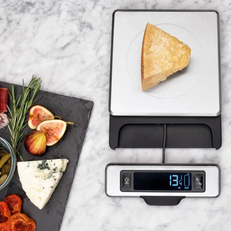 Vekten måler opptil 5 kg, enten du veier rett på overflaten eller i en beholder. En indikator viser hvor mye kapasitet som gjenstår, og «Zero»-knappen lar deg nullstille vekten for å utligne skålens vekt eller legge til flere ingredienser fortløpende.