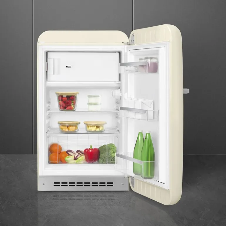 Smeg FAB10 Retro-kjøleskap i kremfarge med frysedel kombinerer klassisk design og moderne funksjonalitet i en kompakt pakke. Med sin ikoniske 50-tallsstil og høyrehengte dør passer dette kjøleskapet perfekt inn i ethvert hjem som ønsker en blanding av nostalgi og praktisk bruk.