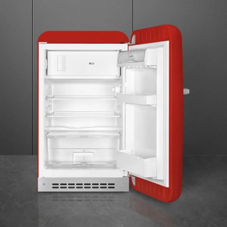 Smeg kjøleskap (FAB10) i retro 50`s design i fargen rød, høyrehengt med frysedel.