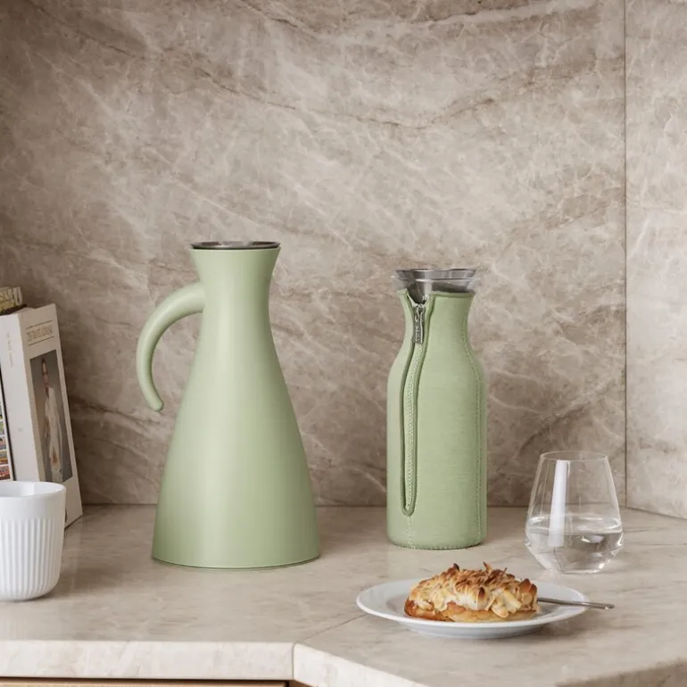Eva Solo kjøleskapskaraffel på 1L i fargen pistachio er en stilren karaffel som passer perfekt i kjøleskapsdøren. Den er ideell til både varme og kalde drikker, og det praktiske designet gjør den enkel å bruke i enhver situasjon.