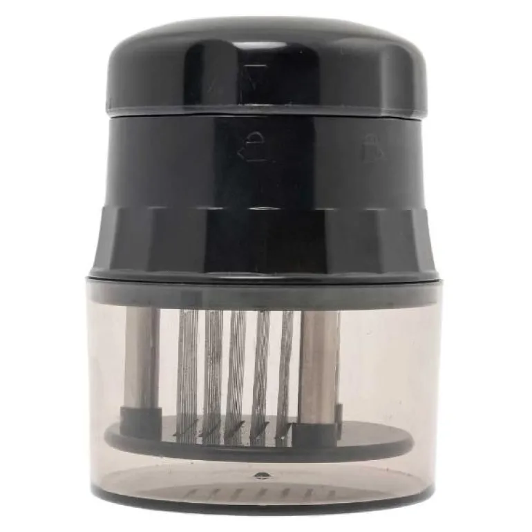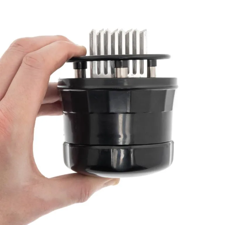 Kamadu Sumos kjøttmørner med 56 nåler er det perfekte verktøy for å gjøre kjøttet ditt virkelig mørt og smakfullt. Ved hjelp av de 56 små nålene marineres kjøttstykket dypere. De superskarpe nålene skjærer gjennom alle kjøttstykker. Enkel å bruke, bare trykk ned med håndflaten. Mål:Lengde: 11 cmDiameter: 8 cm