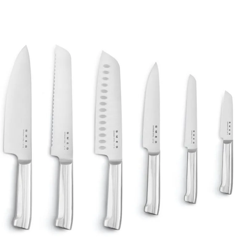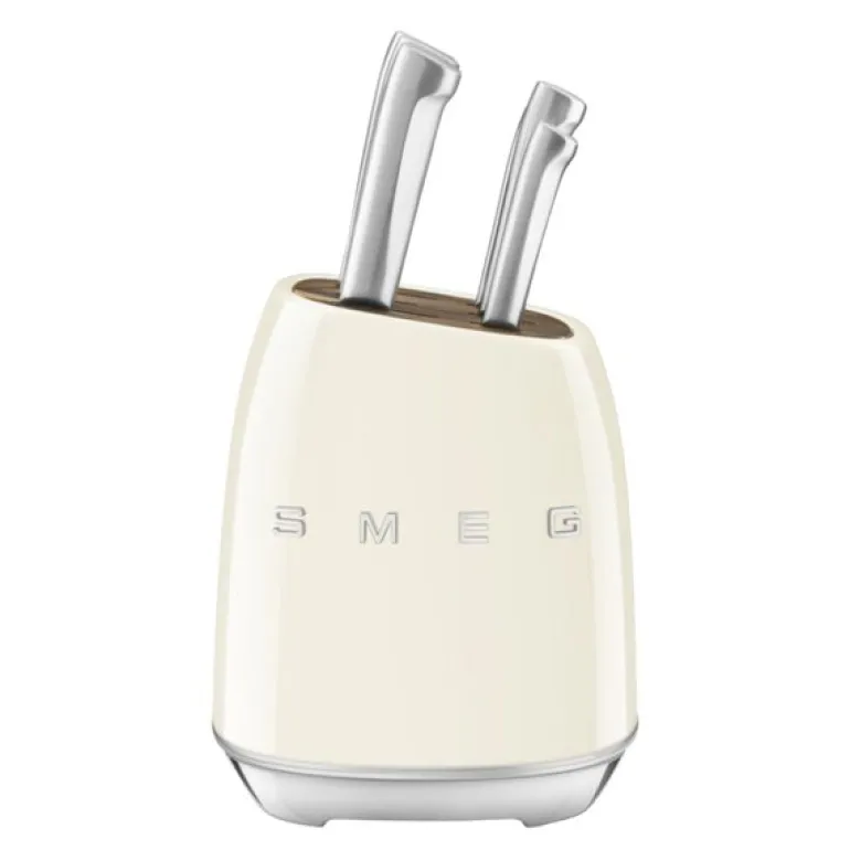 50’s style knivblokk m/6 kniver KBSF02 krem fra Smeg. Dette eksklusive knivblokksettet kombinerer tidløst design med høy funksjonalitet, perfekt for det moderne kjøkken. Knivblokken er laget av akasietre og har et slitesterkt pulverlakkert karbonstålhus som gir både et robust og estetisk tiltalende uttrykk. Den sklisikre basen sørger for at blokken står stødig, selv når du bruker de skarpeste knivene.