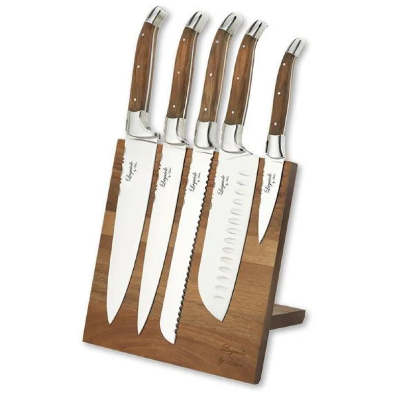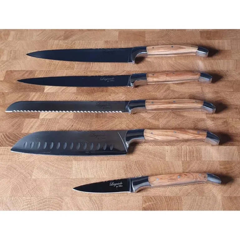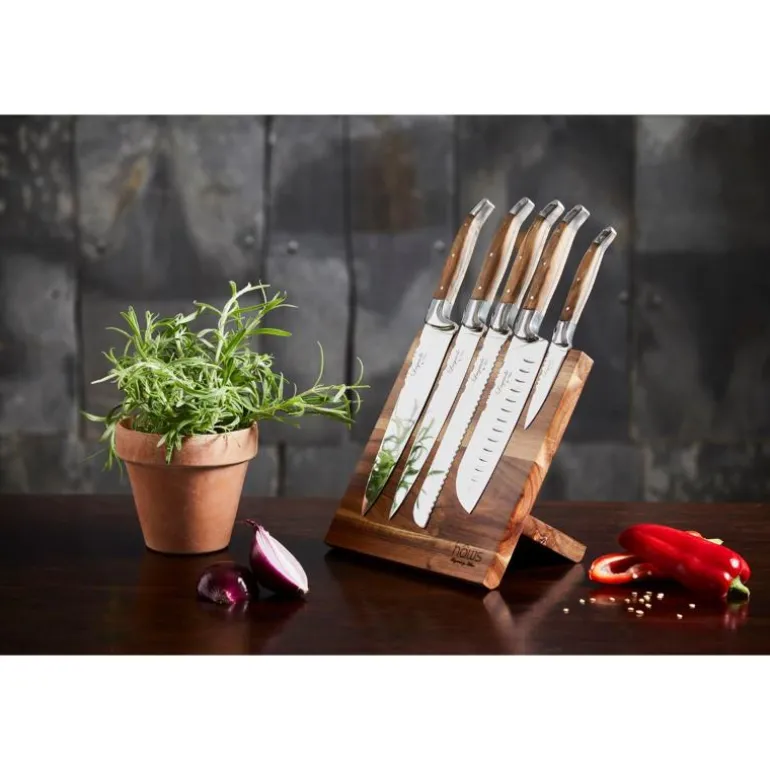Knivene er laget av 420 rustfritt stål og er merket med en logo. Knivsettet består av 5 forskjellige kniver med håndtak av oliventre og en magnetisk knivblokk.