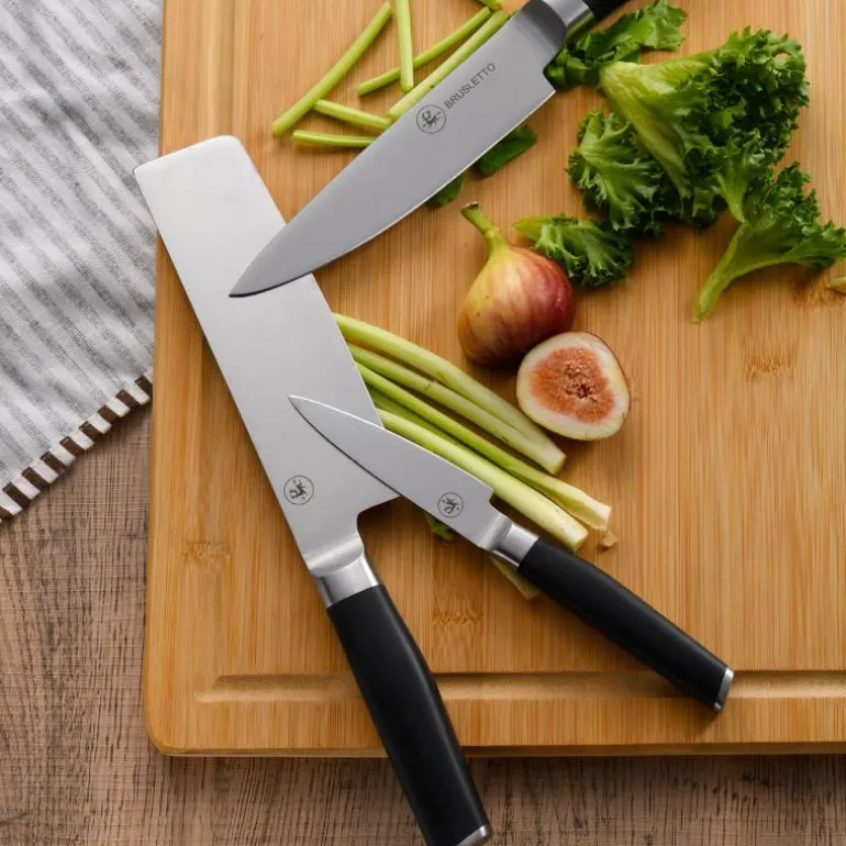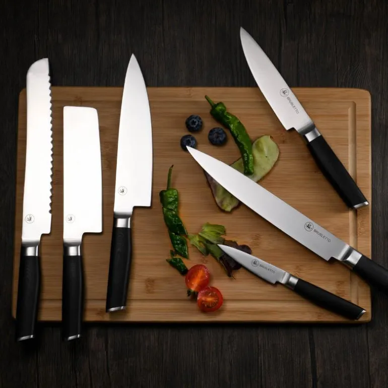 Knivsett i 6 deler fra Brusletto. Knivene er produsert i tysk stålkvalitet med en hardhet på 57+/-2 rockwell – en skikkelig kniv med andre ord. Håndtaket er av en høykvalitets kompositt med sofistikert design som ligger godt i hånden. Dette er stødige og gode kniver du vil ha glede av i mange år.