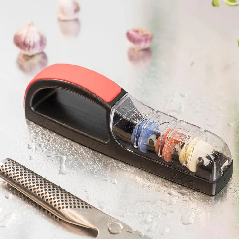 Vedlikehold kjøkkenknivene dine ved å av og til skjerpe dem med MinoSharps prisvinnende knivsliper. Alt du trenger å gjøre er å fylle knivsliperen med litt vann og trekke noen drag med kniven gjennom de forskjellige hjulene, så blir skarpheten som ny. Knivsliperen har tre slipehjul i forskjellige størrelser: grov (120 i kornstørrelse), medium grov (240 i kornstørrelse) og fin (600 i kornstørrelse).