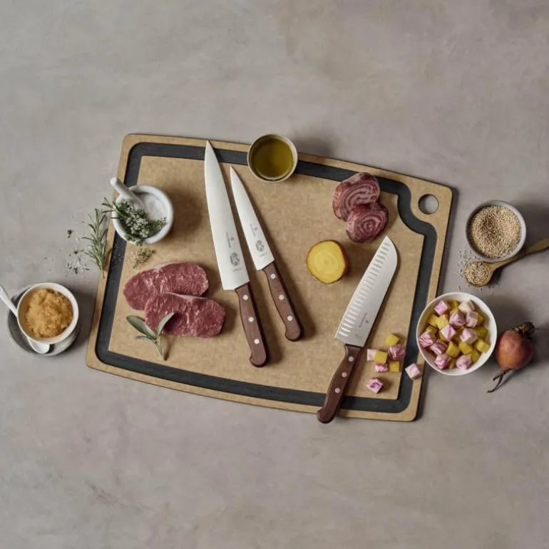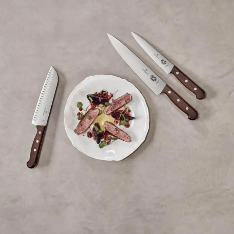 Victorinox Wood, en serie kniver og tilbehør med tidløst design og håndtak i polert rosentre. Håndtakene FSC-sertifisert. Rosentre er et hardt treslag med høyt oljeinnehold og krymper derfor lite. Håndtak i Wood serien har høy glans og er også motstandsdyktig mot fukt.