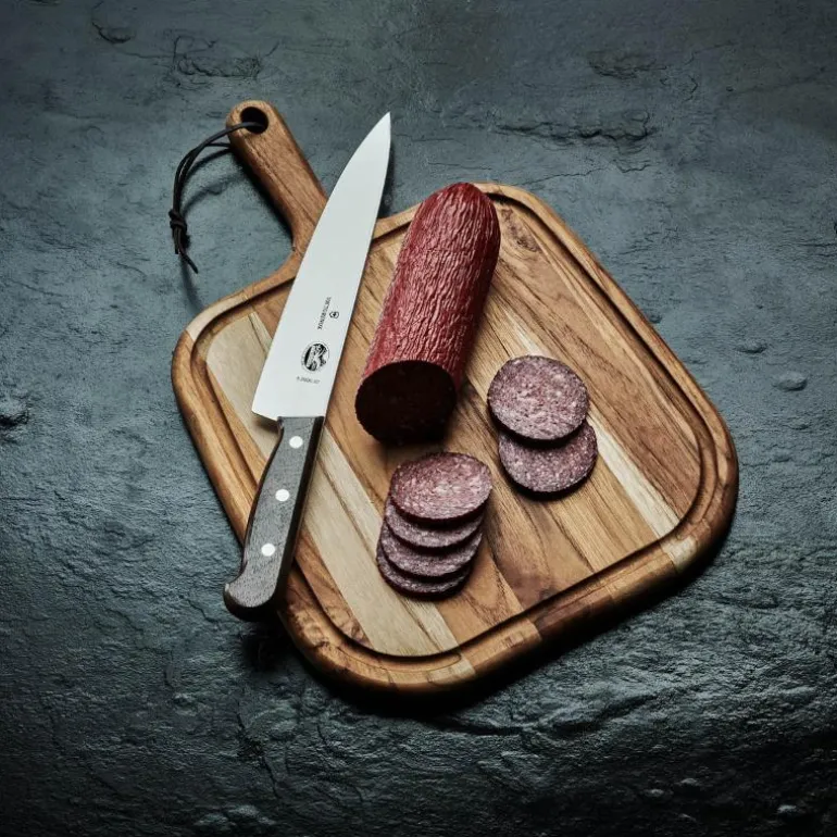 Trancherkniv fra Victorinox. 25 cm lang og med treskaft i Kebony. Allround arbeidskniv. Velegnet til hakking av grønnsaker og annet grovarbeid. Victorinox sine produkter har livstidsgaranti mot material- og produksjonsfeil. Du skal lete lenge etter en profesjonell kokk som ikke bruker Victorinox daglig