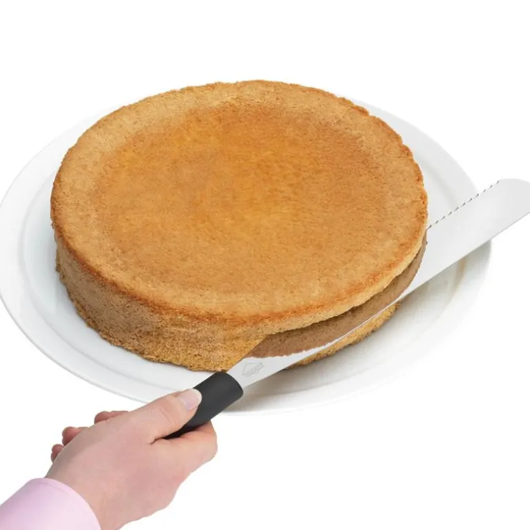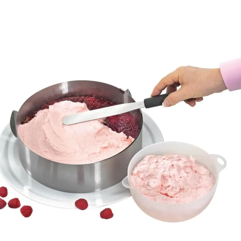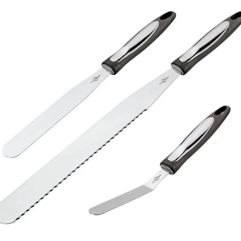 Konditorspadesettet består av en kakekniv med glatt side, en slikkepott og en vinklet slikkepott. Med den taggete kanten på kakekniven i rustfritt stål kan du enkelt kutte kakebunner. Den taggete kanten på kakekniven kan også brukes til å lage et bølget design på kakekremen. Du kan bruke slikkepotten til å fordele store mengder krem og fyll. Vinkelspaden er god til finjusteringer og til å fordele krem og fyll i springformer og andre harde former. Alle konditorspadene er laget av rustfritt stål og plasthåndtak. Spatlene er henholdsvis 39 cm, 29 cm og 25 cm.
