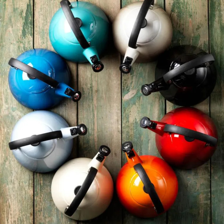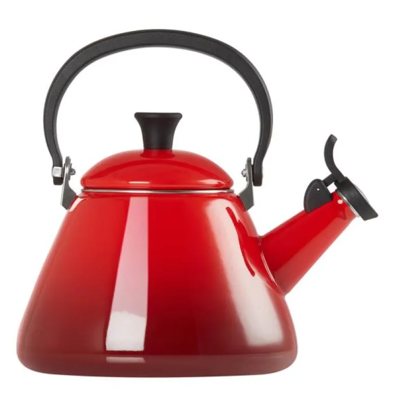 Le Creusets Kone-kjele med fløyte er en klassisk, emaljert stålkjele som kan brukes på alle varmekilder inklusiv induksjon. Kone-kjelen har et varmebestandig håndtak og en fast fløyte, som er lett å åpne når vannet skal helles ut. Kjelen rommer opptil 1,6 l vann, og den maksimale vannkapasiteten er markert på siden av kjelen for å unngå at den koker over.