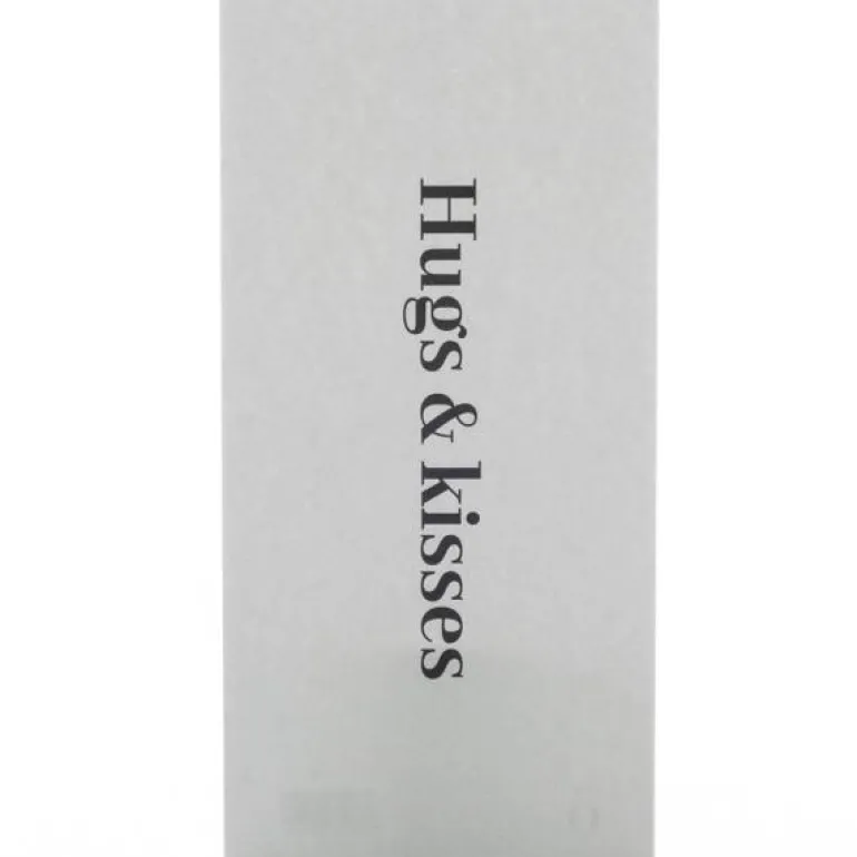 Et avlangt, beige kort med teksten Hugs & kisses skrevet i svart. Kortets bakside er hvit, uten tekst.