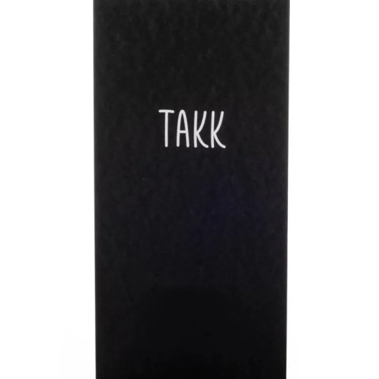 Et avlangt, svart kort med teksten TAKK skrevet i hvitt. Kortets bakside er hvit, uten tekst.