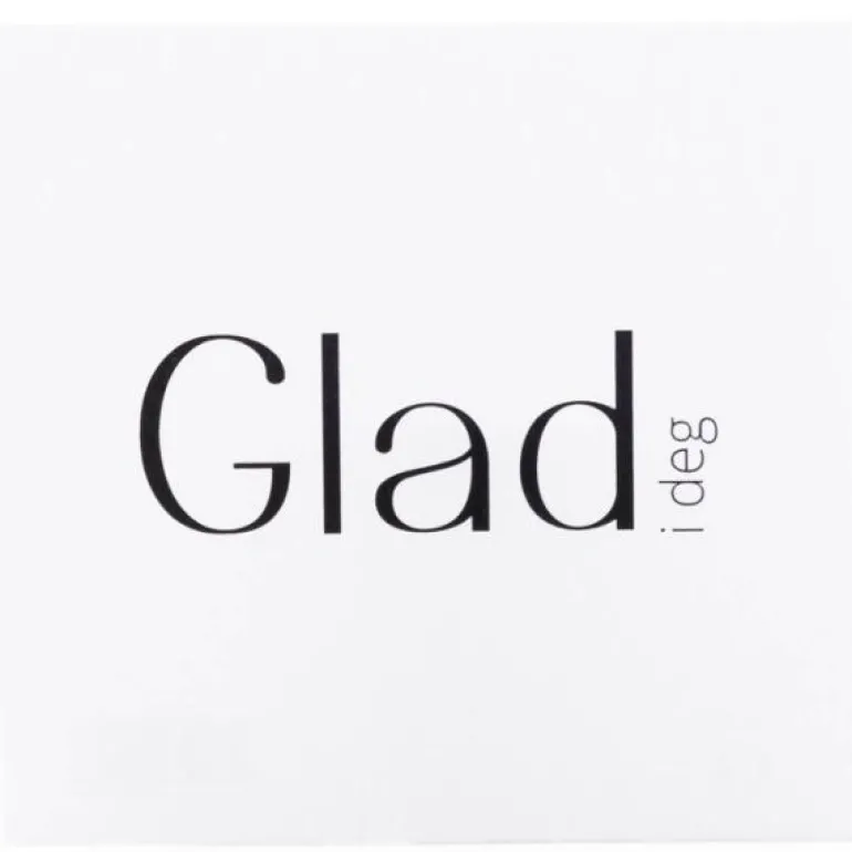 Et enkelt, hvitt kort med teksten Glad i deg skrevet i svart. Kortets bakside er hvit, uten tekst.