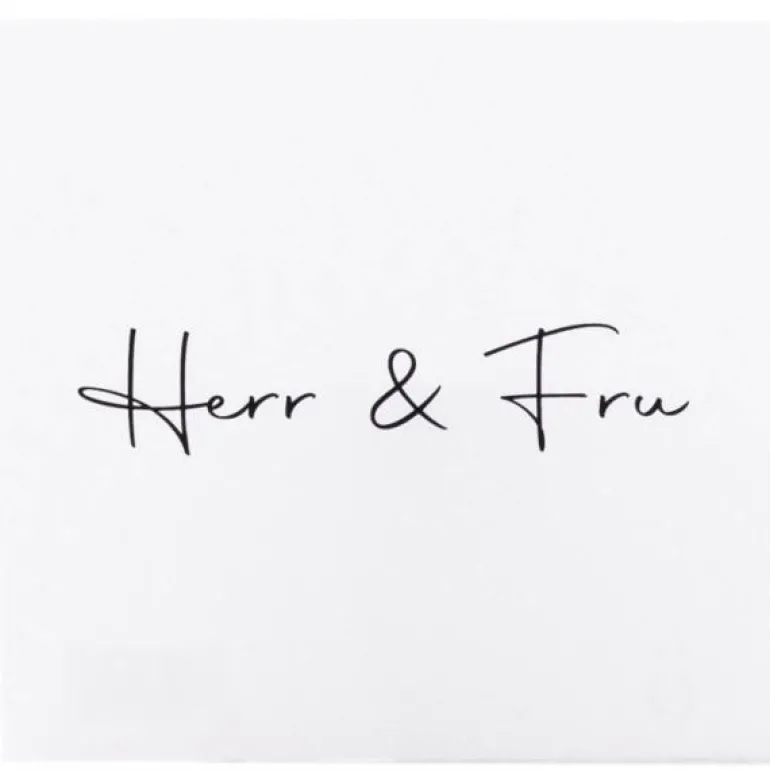 Et enkelt, hvitt kort med teksten Herr & Fru skrevet i svart. Kortets bakside er hvit, uten tekst.