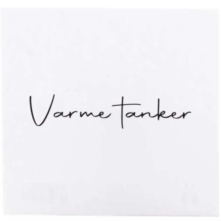 Et enkelt, hvitt kort med teksten varme tanker skrevet i svart. Kortets bakside er hvit, uten tekst.