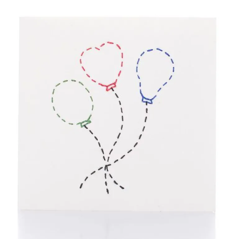 Produktet måler 13x13cm og er laget av hvitt papir som er håndbrodert med bomullstråd. Hvert kort er signert på baksiden av den enkelte produsent. Konvolutt medfølger.