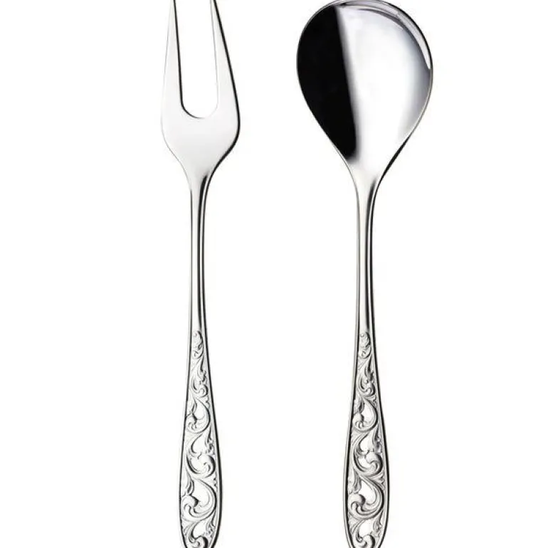Serveringssett 2 deler fra den unike Kristin-serien fra Hardanger Bestikk. Bestikket er produsert med helt spesiell teknikk, inspirert av norsk treskjæring. Serveringsskjeen og serveringsgaffelen har gripevennlig håndtak, god dybde og komplementerer hverandre for sømløs servering. Stålet som er av 18/10 rustfritt stål tåler oppvaskmaskin, og produktet har livstidsgaranti. Serveringssettet leveres i gaveeske og inneholder;