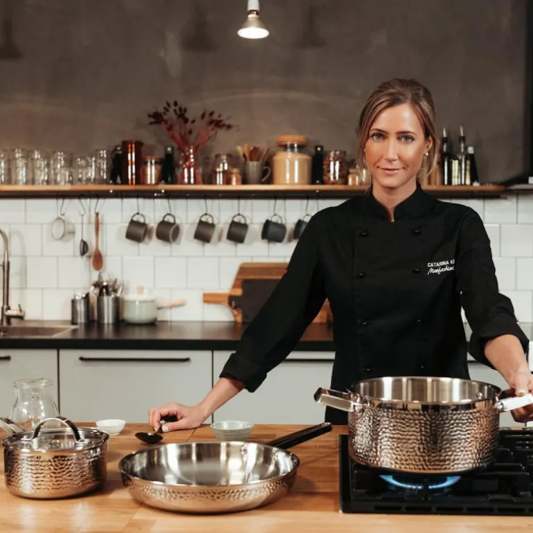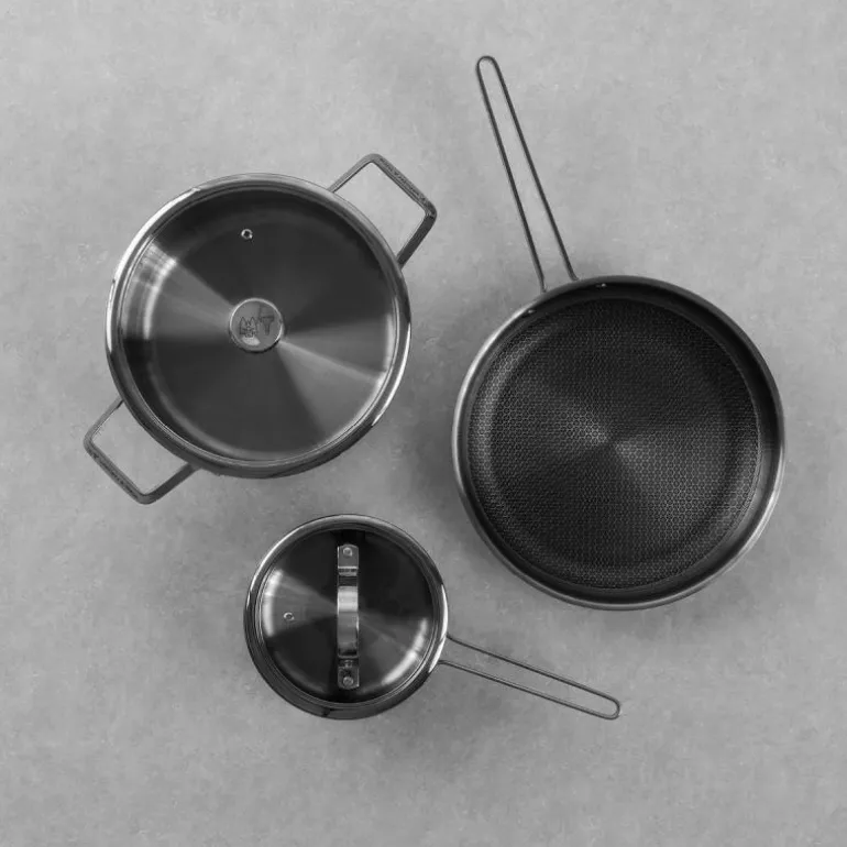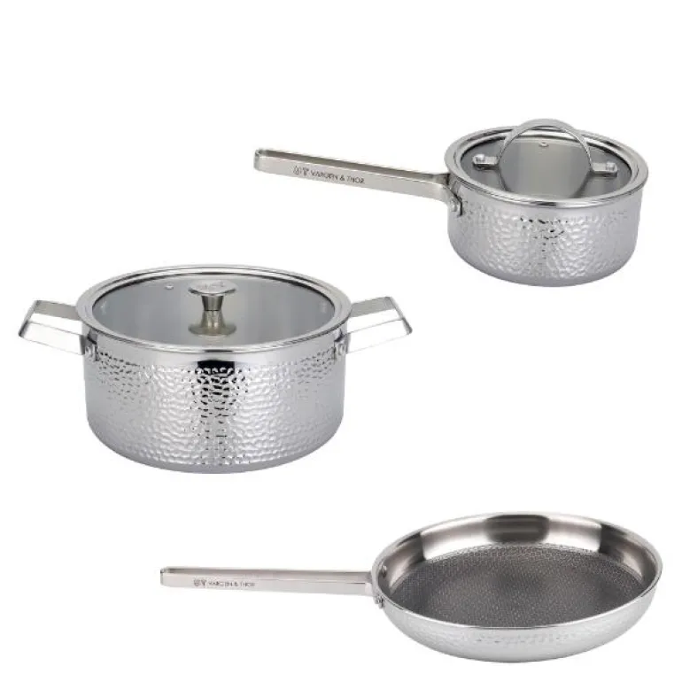 Alle delene i settet er laget av høykvalitets rustfritt stål med en vakker polert og hamret overflate, noe som gir både styrke og estetikk. Innsiden er laget av børstet rustfritt stål, som sørger for at maten ikke fester seg like lett som på andre overflater, og gjør dermed rengjøringen enklere. Håndtakene er varmebestandige og rustfrie, noe som gir trygg håndtering under høye temperaturer.