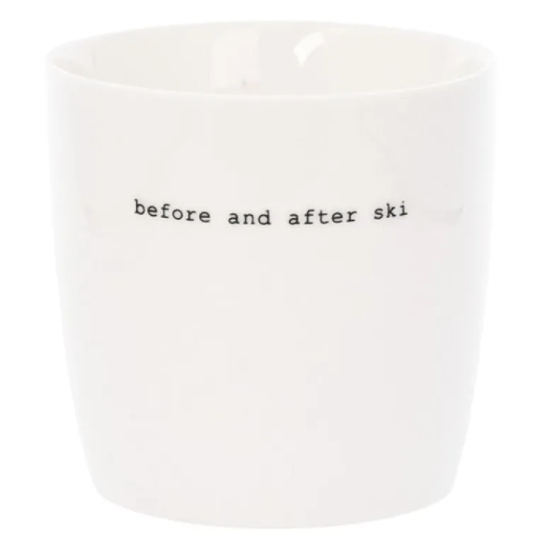 Hvitt krus fra Sögne Home, med teksten before and after ski i svart. Det håndlagde sögne kruset så dagens lys i 2013, og har med sitt tynne porselen og gode hank, blitt manges favoritt! Kolleksjonen av krus kommer i ulike farger, størrelser og utvalgte populære tekster. Sögne sine krus er blitt folkekjære favoritter som de er stolte av! Krusene er med sitt tidløse design laget for å vare i generasjoner og fylle din dag med et treffende hverdags budskap. Krusene er hyggelig å bruke der du er med familie, venner, kollegaer og som gave for ulike anledninger. Krus med varme verdier.