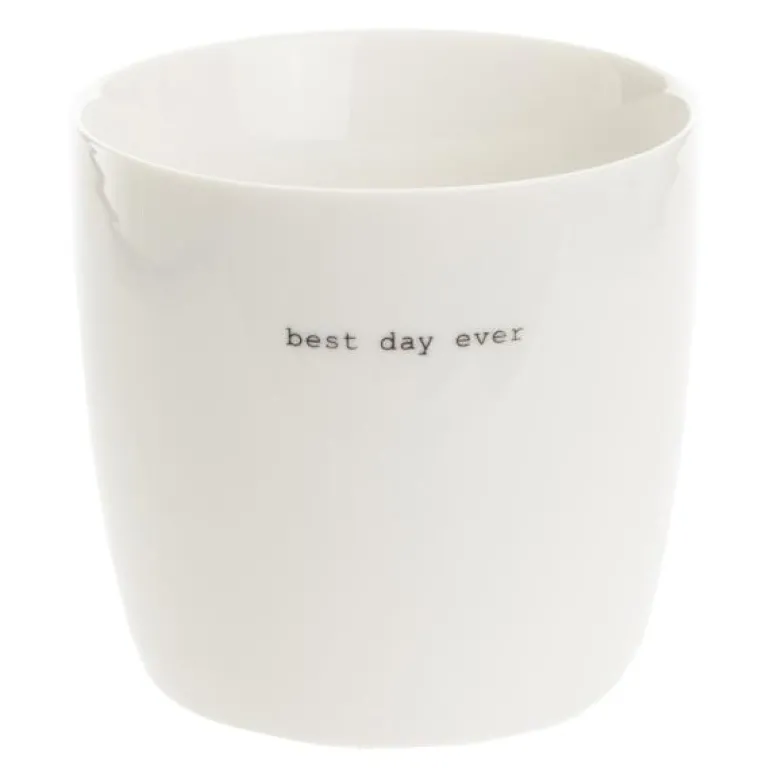 Hvitt krus fra Sögne Home, med teksten best day ever i svart. Det håndlagde sögne kruset så dagens lys i 2013, og har med sitt tynne porselen og gode hank, blitt manges favoritt! Kolleksjonen av krus kommer i ulike farger, størrelser og utvalgte populære tekster. Sögne sine krus er blitt folkekjære favoritter som de er stolte av! Krusene er med sitt tidløse design laget for å vare i generasjoner og fylle din dag med et treffende hverdags budskap. Krusene er hyggelig å bruke der du er med familie, venner, kollegaer og som gave for ulike anledninger. Krus med varme verdier.
