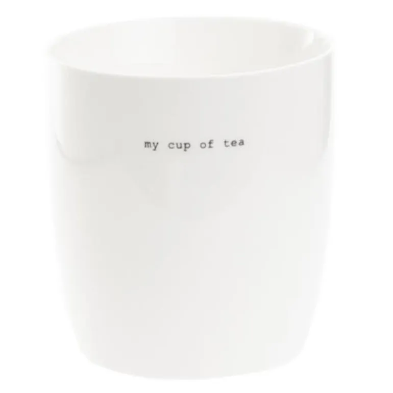 Stort, hvitt krus fra Sögne Home, med teksten my cup of tea i svart. Det håndlagde sögne kruset så dagens lys i 2013, og har med sitt tynne porselen og gode hank, blitt manges favoritt! Kolleksjonen av krus kommer i ulike farger, størrelser og utvalgte populære tekster. Sögne sine krus er blitt folkekjære favoritter som de er stolte av! Krusene er med sitt tidløse design laget for å vare i generasjoner og fylle din dag med et treffende hverdags budskap. Krusene er hyggelig å bruke der du er med familie, venner, kollegaer og som gave for ulike anledninger. Krus med varme verdier.