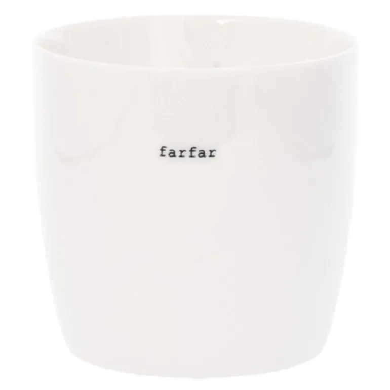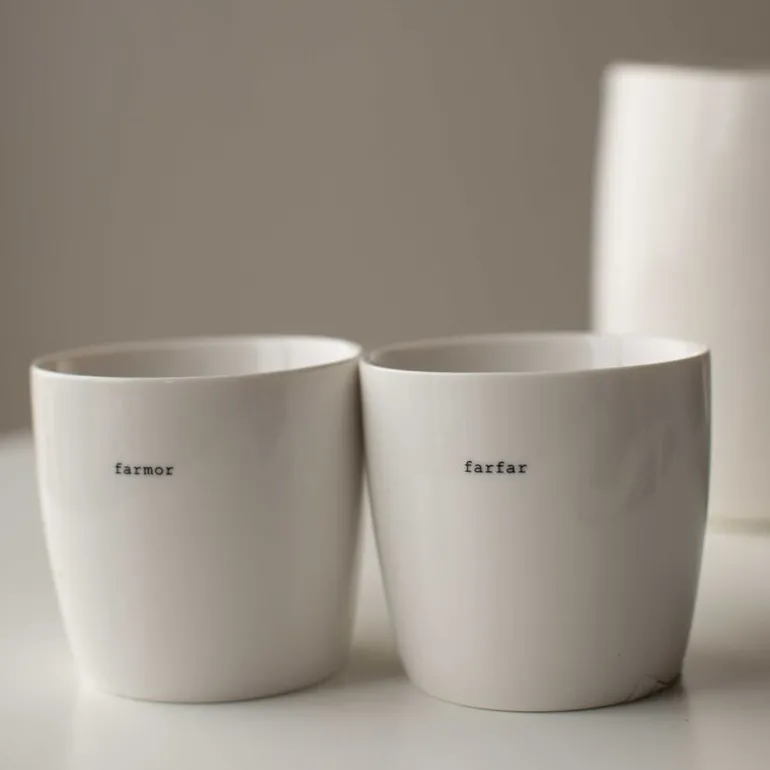 Hvitt krus fra Sögne Home, med teksten farfar i svart. Det håndlagde sögne kruset så dagens lys i 2013, og har med sitt tynne porselen og gode hank, blitt manges favoritt! Kolleksjonen av krus kommer i ulike farger, størrelser og utvalgte populære tekster. Sögne sine krus er blitt folkekjære favoritter som de er stolte av! Krusene er med sitt tidløse design laget for å vare i generasjoner og fylle din dag med et treffende hverdags budskap. Krusene er hyggelig å bruke der du er med familie, venner, kollegaer og som gave for ulike anledninger. Krus med varme verdier.