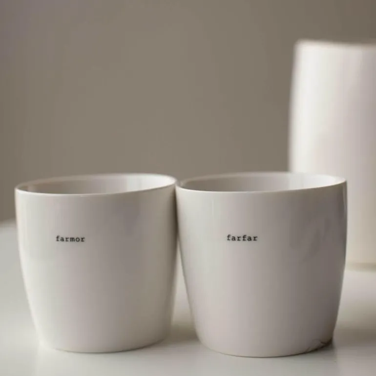 Hvitt krus fra Sögne Home, med teksten farmor i svart. Det håndlagde sögne kruset så dagens lys i 2013, og har med sitt tynne porselen og gode hank, blitt manges favoritt! Kolleksjonen av krus kommer i ulike farger, størrelser og utvalgte populære tekster. Sögne sine krus er blitt folkekjære favoritter som de er stolte av! Krusene er med sitt tidløse design laget for å vare i generasjoner og fylle din dag med et treffende hverdags budskap. Krusene er hyggelig å bruke der du er med familie, venner, kollegaer og som gave for ulike anledninger. Krus med varme verdier.