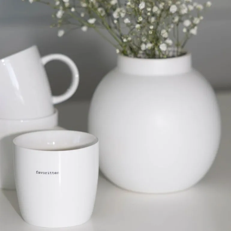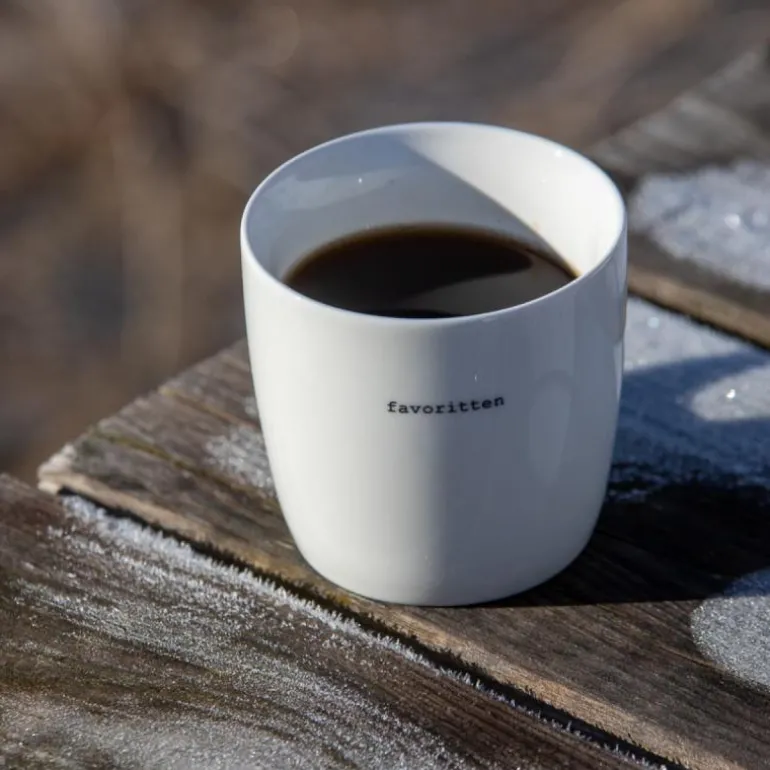 Hvitt krus fra Sögne Home, med teksten favoritten i svart. Det håndlagde sögne kruset så dagens lys i 2013, og har med sitt tynne porselen og gode hank, blitt manges favoritt! Kolleksjonen av krus kommer i ulike farger, størrelser og utvalgte populære tekster. Sögne sine krus er blitt folkekjære favoritter som de er stolte av! Krusene er med sitt tidløse design laget for å vare i generasjoner og fylle din dag med et treffende hverdags budskap. Krusene er hyggelig å bruke der du er med familie, venner, kollegaer og som gave for ulike anledninger. Krus med varme verdier.
