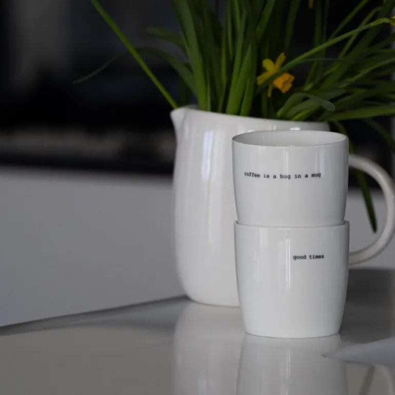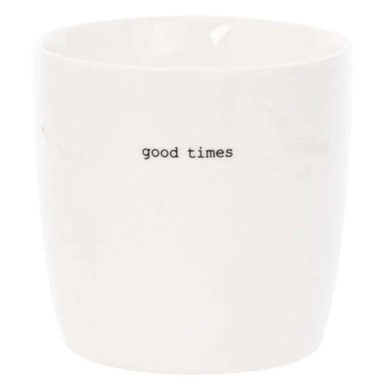 Hvitt krus fra Sögne Home, med teksten good times i svart. Det håndlagde sögne kruset så dagens lys i 2013, og har med sitt tynne porselen og gode hank, blitt manges favoritt! Kolleksjonen av krus kommer i ulike farger, størrelser og utvalgte populære tekster. Sögne sine krus er blitt folkekjære favoritter som de er stolte av! Krusene er med sitt tidløse design laget for å vare i generasjoner og fylle din dag med et treffende hverdags budskap. Krusene er hyggelig å bruke der du er med familie, venner, kollegaer og som gave for ulike anledninger. Krus med varme verdier.