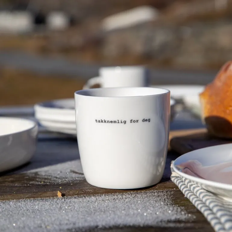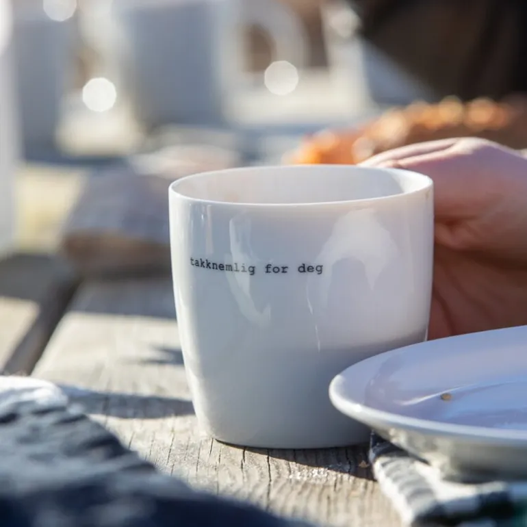 Hvitt krus fra Sögne Home, med teksten takknemlig for deg i svart. Det håndlagde sögne kruset så dagens lys i 2013, og har med sitt tynne porselen og gode hank, blitt manges favoritt! Kolleksjonen av krus kommer i ulike farger, størrelser og utvalgte populære tekster. Sögne sine krus er blitt folkekjære favoritter som de er stolte av! Krusene er med sitt tidløse design laget for å vare i generasjoner og fylle din dag med et treffende hverdags budskap. Krusene er hyggelig å bruke der du er med familie, venner, kollegaer og som gave for ulike anledninger. Krus med varme verdier.