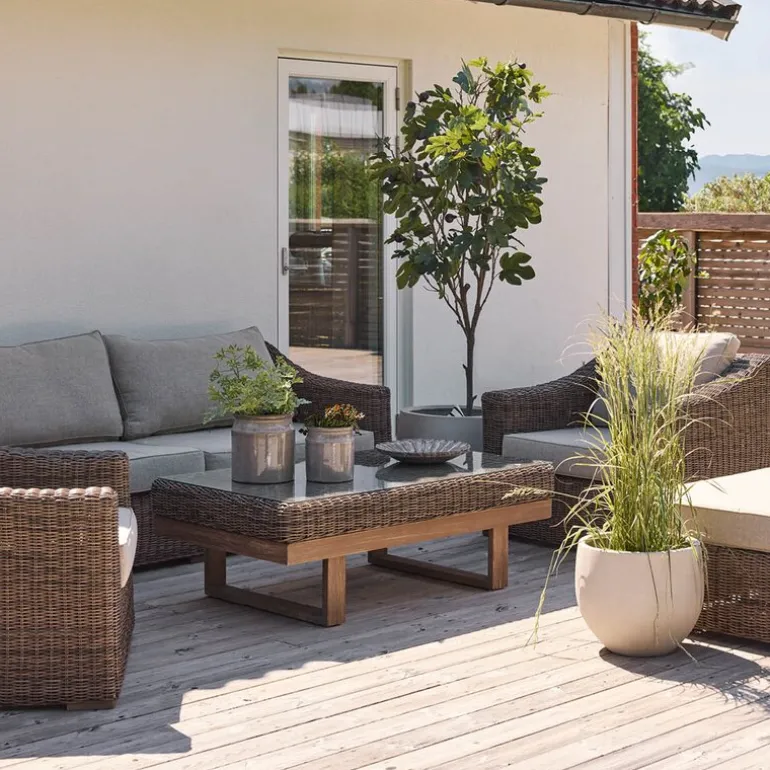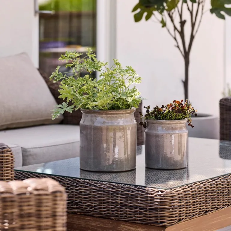 Krukkene er utstyrt med dreneringshull i bunnen, noe som gjør dem ideelle for utendørsbruk og sikrer optimal drenering for plantene dine. Med sin robuste utførelse og tidløse design passer disse krukkene like godt på en balkong som i en større hage.